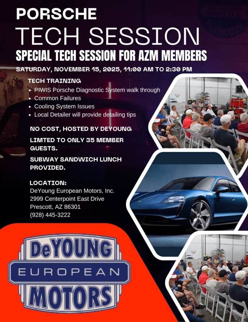 Enjoy a Tech Talk session with the Porsche Pro’s at DeYoung European Motors and lunch too!  Limited to only 35 attendees! Register HERENOTE:  YOU MUST BE REGISTERED TO ATTEND.  DeYoung European Motors is a supporter of the AZM Region and an advertiser on the AZM website.  Learn more about them HERE.