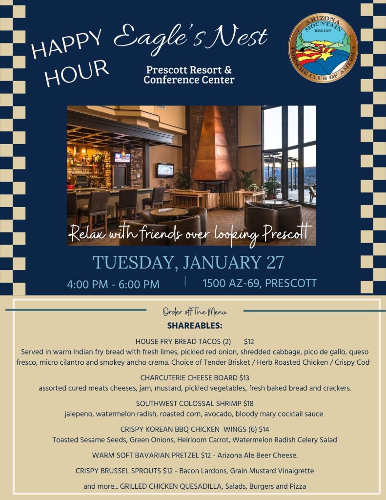 Take a weekday break and join other members for a drop in Happy Hour at the “Eagle’s Nest”, located in the Prescott Resort and Conference Center. This is a new concept the Activities Committee has created for members to enjoy casual, spontaneous get togethers at various locations during the year. Please Register so there is an expected count for the restaurant HERE.