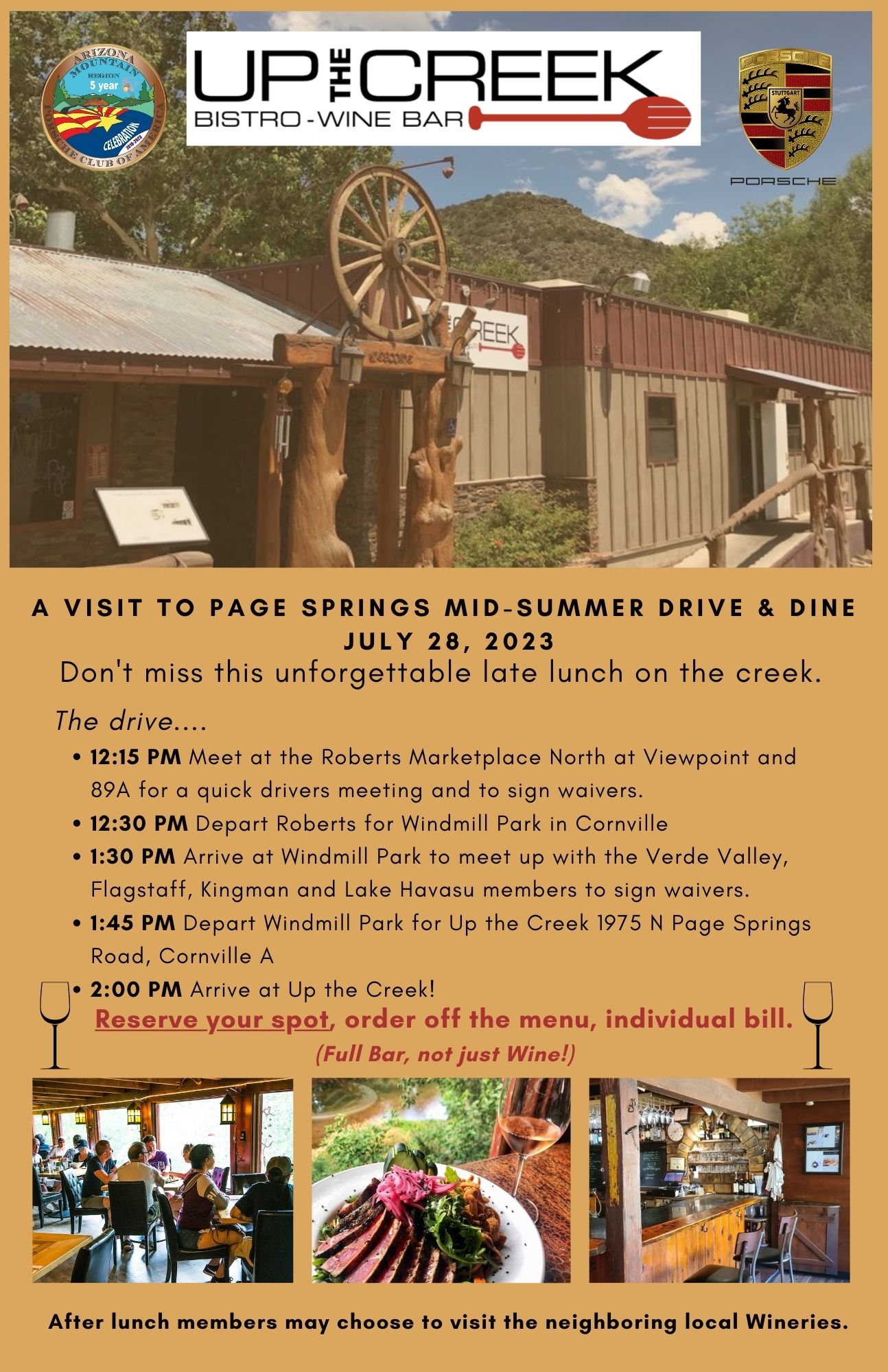 - Event Location: Up the Creek Bistro – Wine Bar: 1975 N Page Springs Rd, Cornville, AZ 86325
