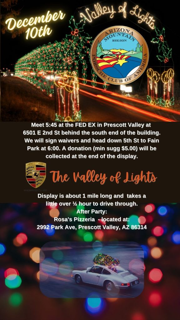 A Holiday favorite is the drive through the Valley of Lights in Prescott Valley.  Join other members for the lights then a social and dinner at Rosa’s Restaurant.  Register now HERE. See details for meeting place, schedule, etc. below in details.