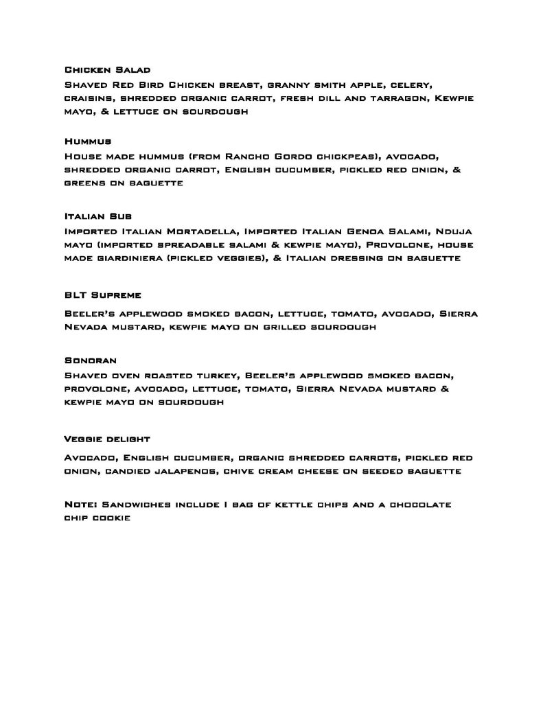 - Lunch is available from Pangaea. Choose from Chicken Salad, Hummus Plate, Italian Sub, BLT Supreme, Sonoran Turkey Sandwich, Veggie Delight Baguette, All include kettle chips and chocolate chip cookie. See menu descriptions below.