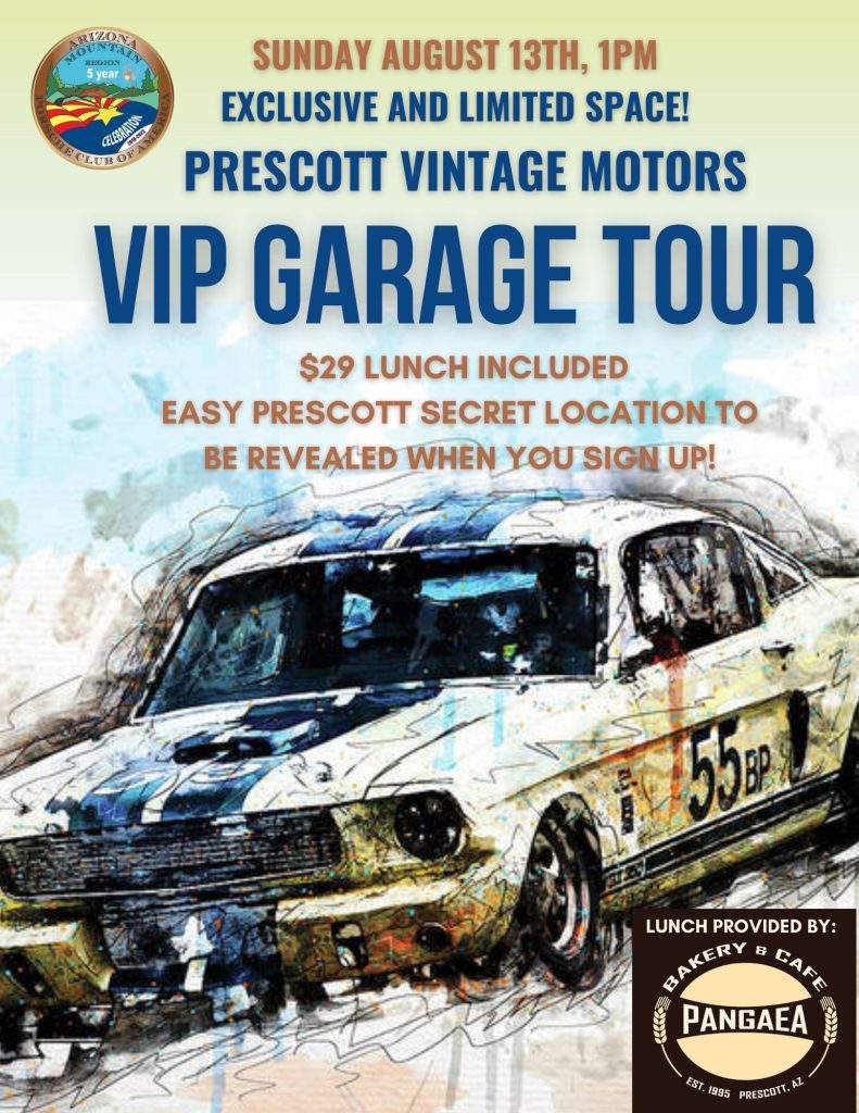 A terrific Garage Tour of a private collection in Prescott. $29 per person price includes tour AND lunch. Click event for more details. ONLY 35 spots available. Register HERE.
