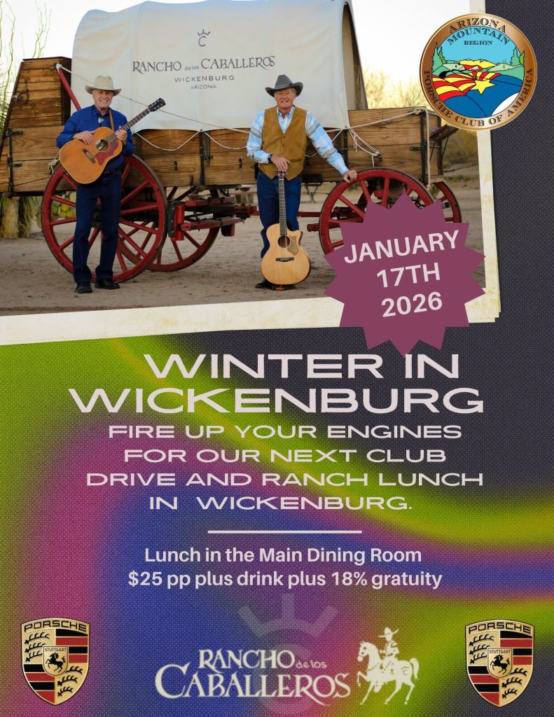Saturday, January 17, 2026 – meet at 10:00 AM in the parking lot area close to Pangea Bakery located at Gail Gardner Way & Iron Springs Rd in Prescott. Drivers meeting and PCA waiver signing, etc. prior to departure at 10:30AM with arrival at the restaurant in Wickenburg around Noon.